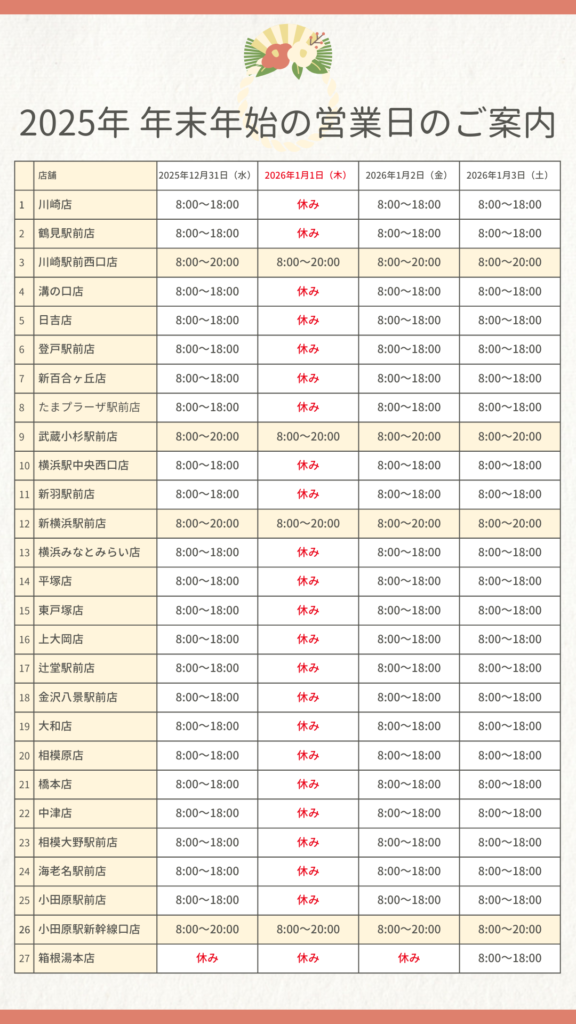 店舗情報 2025-2026年 年末年始営業体制のお知らせ 公開日: 2025.11.12 更新日: 2025.12.15 シェア ポスト はてブ LINE 2025年-2026年 年末年始中の営業体制についてお知らせいたします。ご不便をおかけいたしますが、何卒ご理解いただきますようお願い申し上げます。